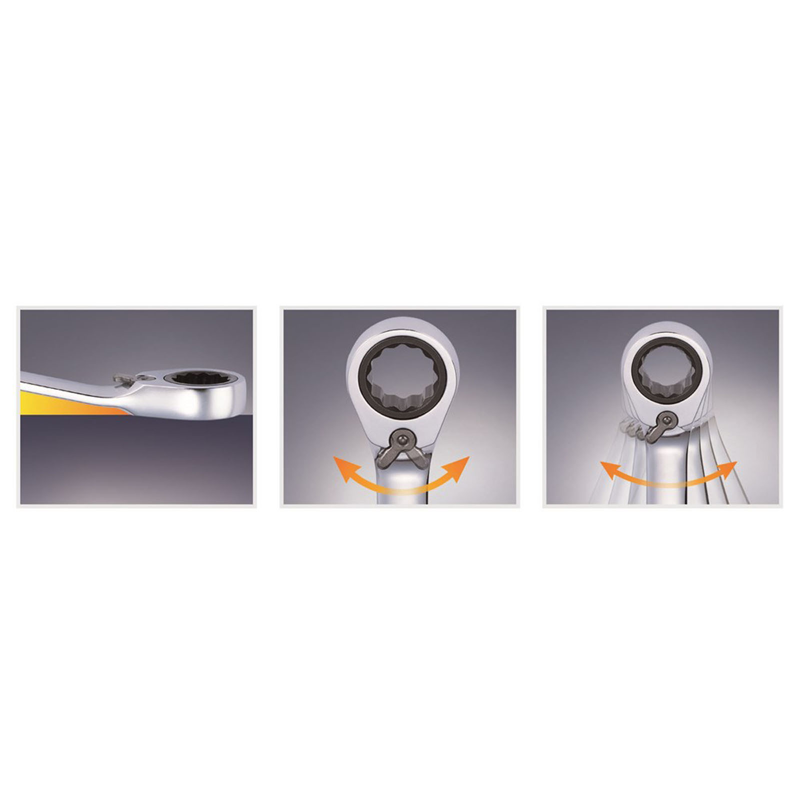 The Kincrome reversible gear spanner has all the benefits of standard spanners and more. The strong fine gear ratcheting ring end needs as little as 2.5° of sweep to move the fastener, a standard fixed ring end needs a minimum of 30°, or 12 times the area. Kincrome Gear Spanner ratcheting ring end has a Peripheral Drive™ configuration that virtually eliminates the rounding off of fasteners. The market leading narrow and thin head, combined with fine gear tooth design makes the Kincrome gear spanner suitable for working in tight and hard to access areas where a ratchet and socket will not fit. The reversible mechanism allows you to change the direction of the gears via the switch, and the 13° offset mimics the characteristics of a conventional combination spanner.